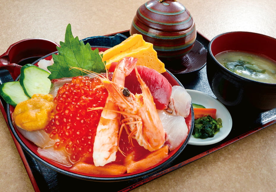 その日水揚げされた旬のネタを敷き詰めた海鮮丼、揚げたての天丼、新鮮なお刺身や郷土料理の定食などをお得な価格でご用意しております。